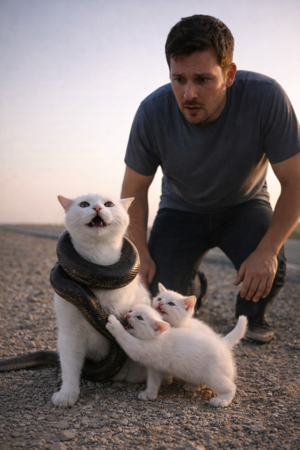 The kittens stayed beside her, meowing anxiously.