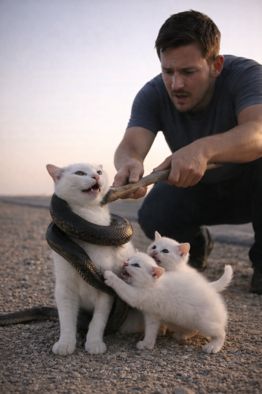 Slowly and carefully, he used it to lift and push the snake away from the cat’s neck.