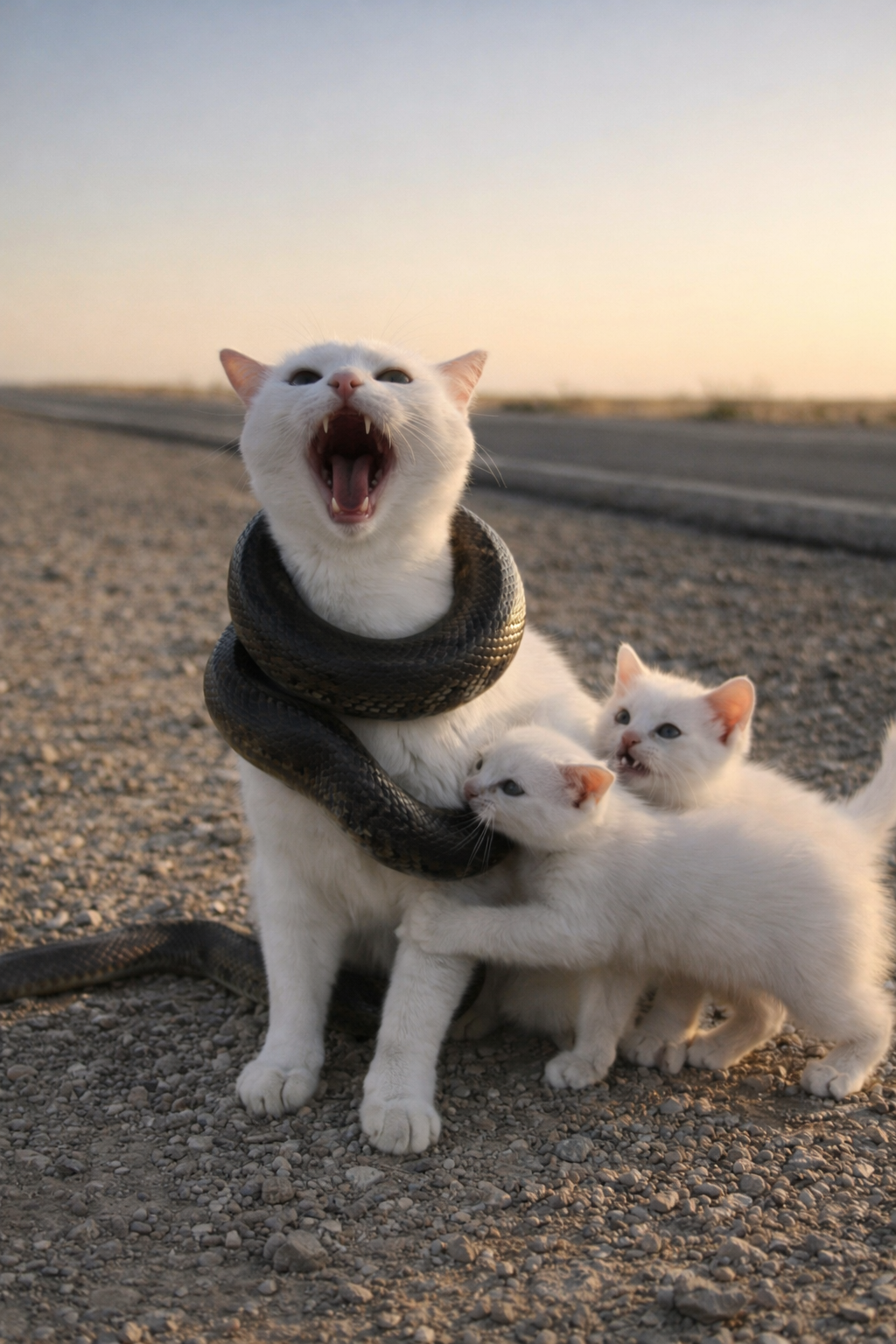The kittens stayed beside her, meowing anxiously.