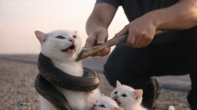 Slowly and carefully, he used it to lift and push the snake away from the cat’s neck.