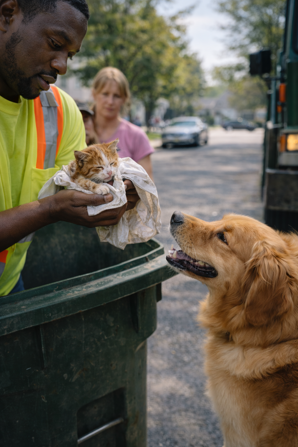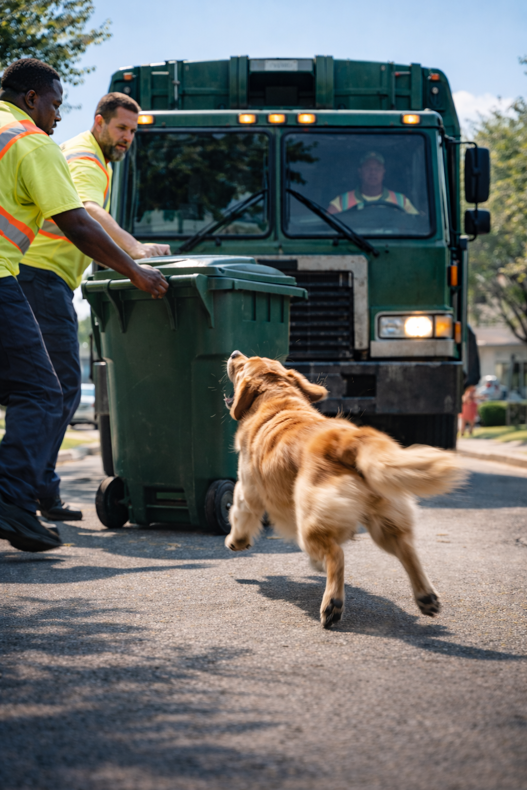 Two sanitation workers stepped down from the truck. At first, they approached calmly, trying to guide the dog away. Their movements were gentle, not aggressive, just enough to clear the path so they could continue their work.