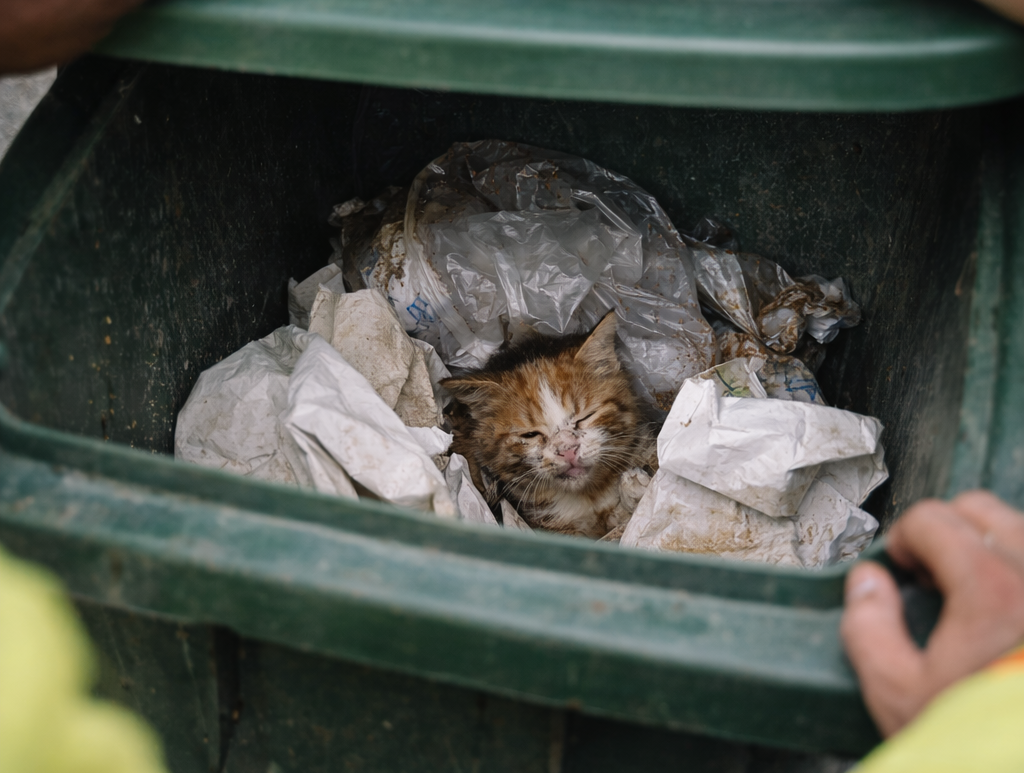 The worker carefully reached inside the bin and lifted the kitten out. It was small, fragile, but alive. Its movements were slow, but visible, enough to confirm that it had survived.