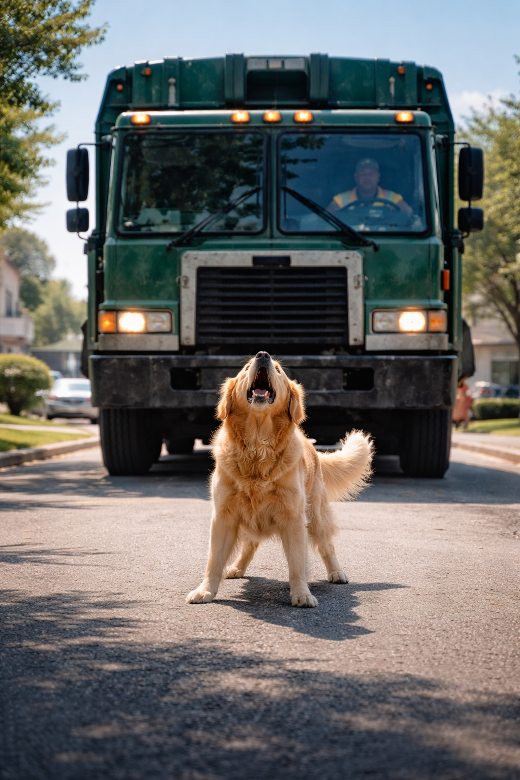 The garbage truck had stopped in the middle of the street, not because of traffic, not because of an obstacle, but because of a dog.