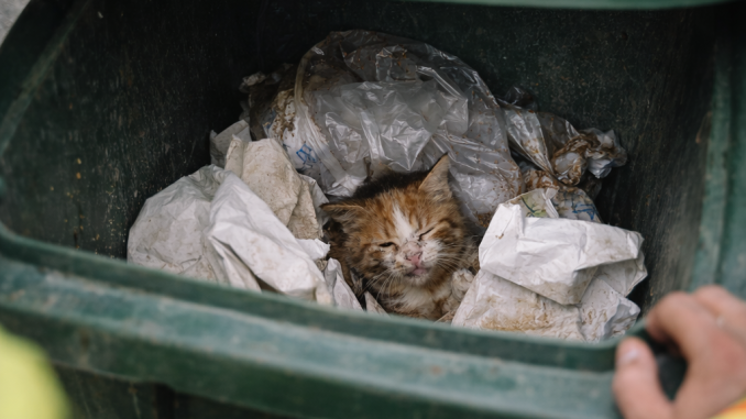 The worker carefully reached inside the bin and lifted the kitten out. It was small, fragile, but alive. Its movements were slow, but visible, enough to confirm that it had survived.