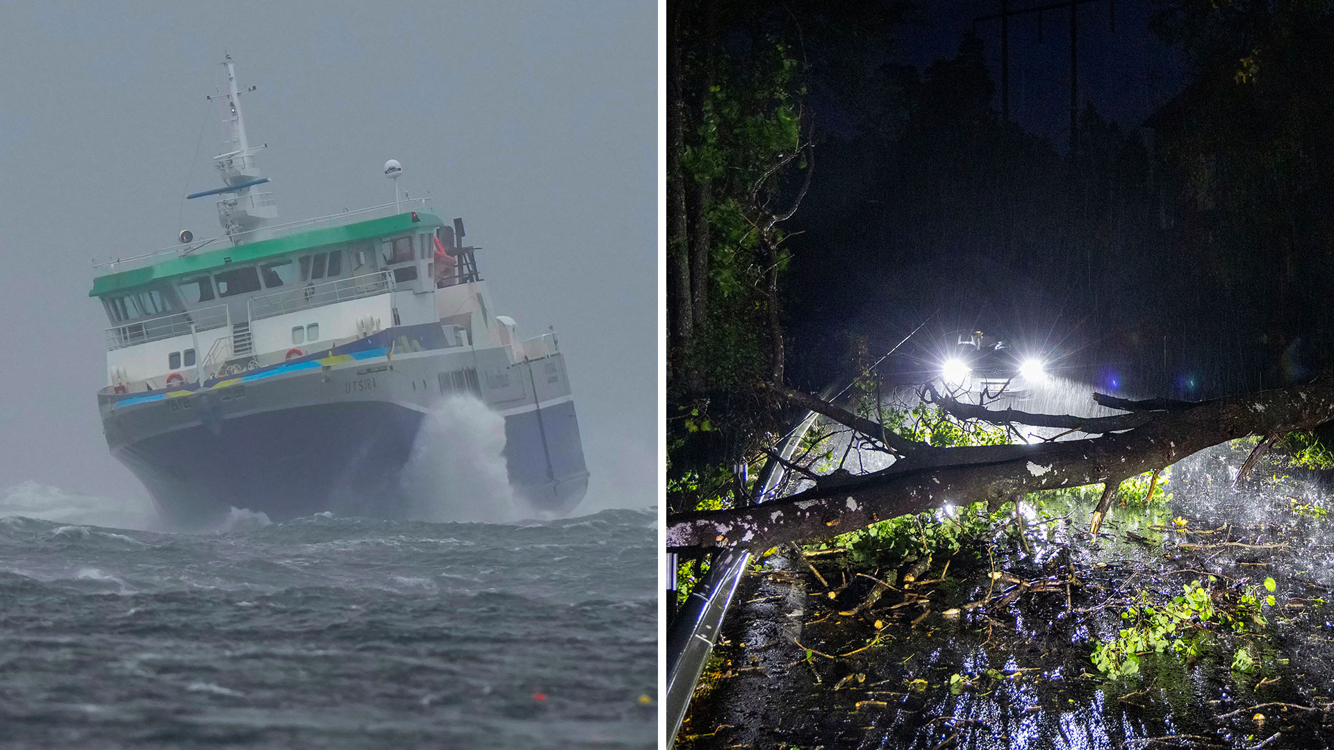 Slår mot SverigeI bergen har vindar på 31,7 sekundmeter uppmätts och under natten har vindarna orsakat flera skador. Taket på en butik har kollapsat och stenras har träffat bilar och vält träd. En bit längre norrut, i Tingvoll, har ett garage blåst upp över en väg som nu är helt blockerad.Och under förmiddagen rör sig stormen in över Sverige. SMHI har utfärdat orange varningar längs både Västkusten och Sydkusten. Samtidigt gäller gula varningar västra Götaland, sydvästra Svealand och längs stora delar av Östkusten. Vindbyar på över 20 meter per sekund väntas i bland annat Malmö, Göteborg och Stockholm.Stormen slår mot västra Sverige på förmiddagen och rör sig sedan vidare österut. EnligtTV4:s meteorolog Martin Hagman får vindarna större konsekvenser eftersom det fortfarande är tidigt på hösten.–Det är en rätt tidig storm och mycket löv på träden, så det är mycket större vindfång när det blåser. Det är därför man också har ställt in mycket tåg och så, just för att det antagligen kommer att fällas en del träd, säger han.