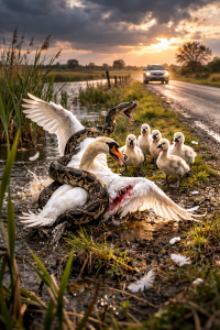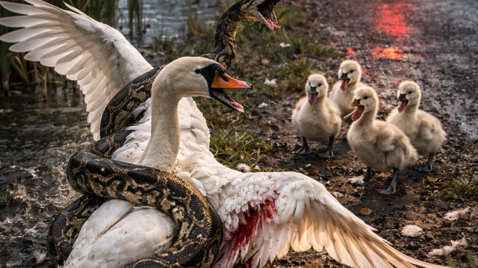 The swan hissed and shifted her wings, trying to shield her babies while maintaining balance.