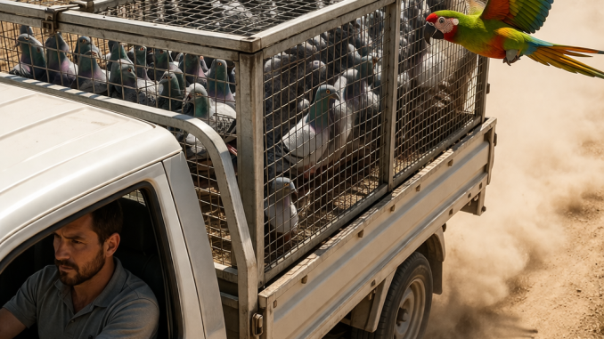 Inside the truck sat a large metal cage filled with dozens of pigeons.