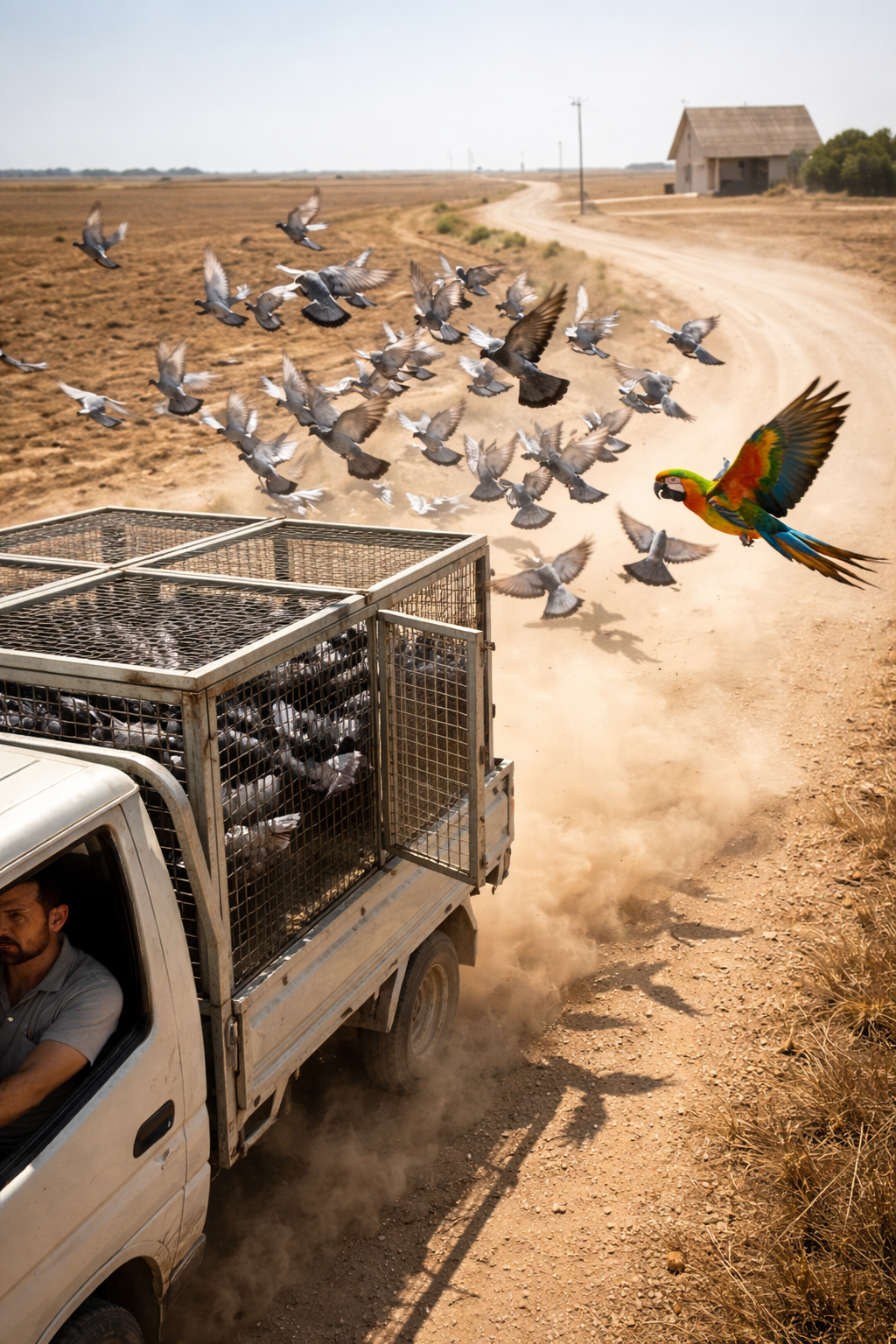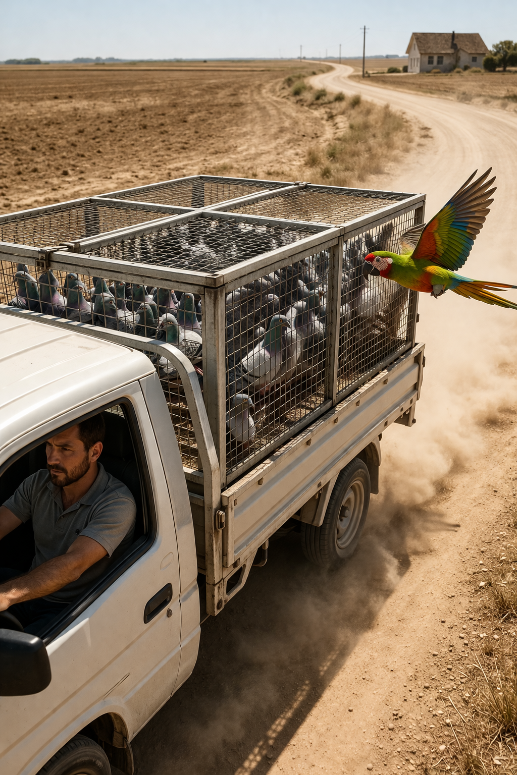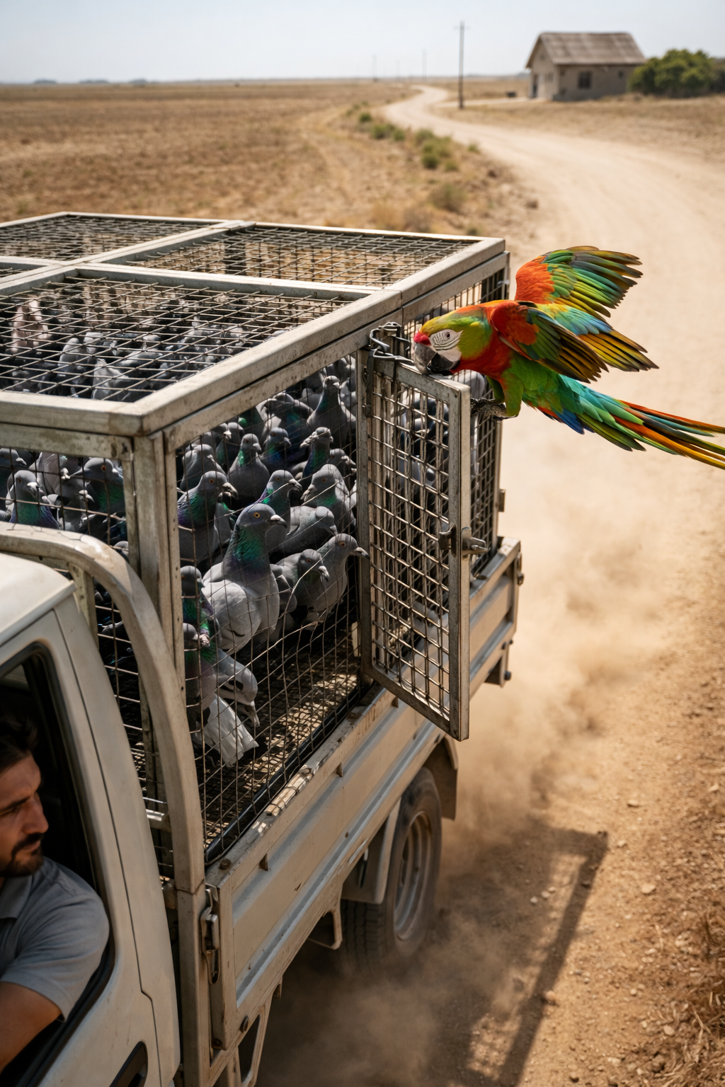 Suddenly, a colorful parrot appeared flying beside the moving truck.