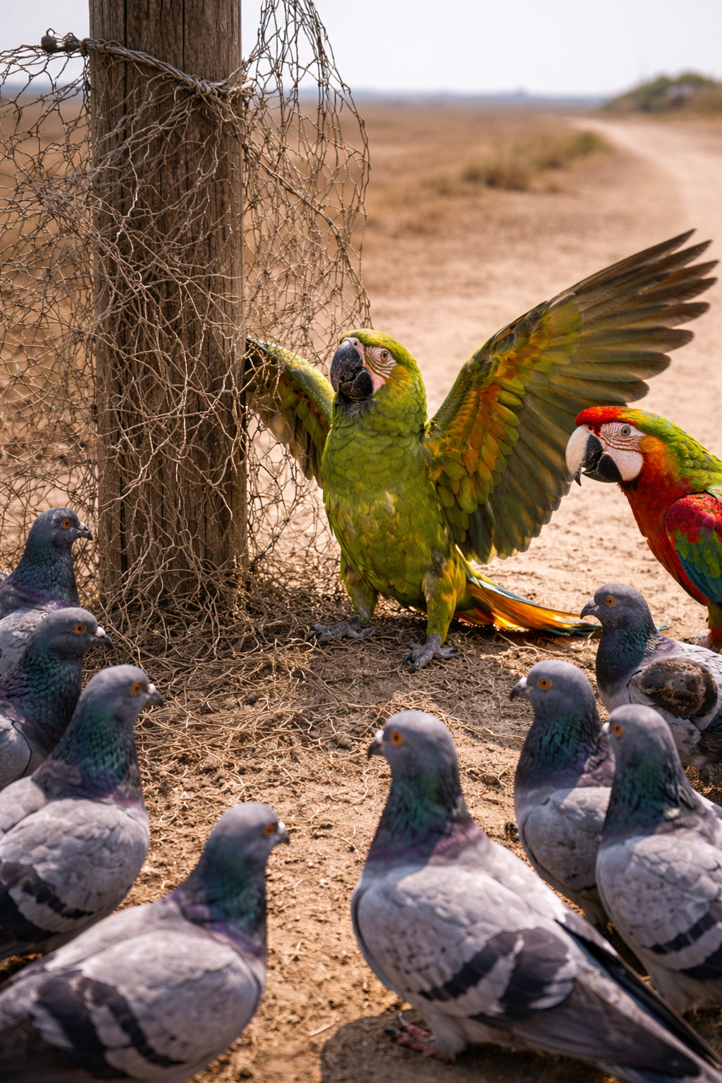Moments later, the flock of pigeons and the first parrot arrived near the fence.
