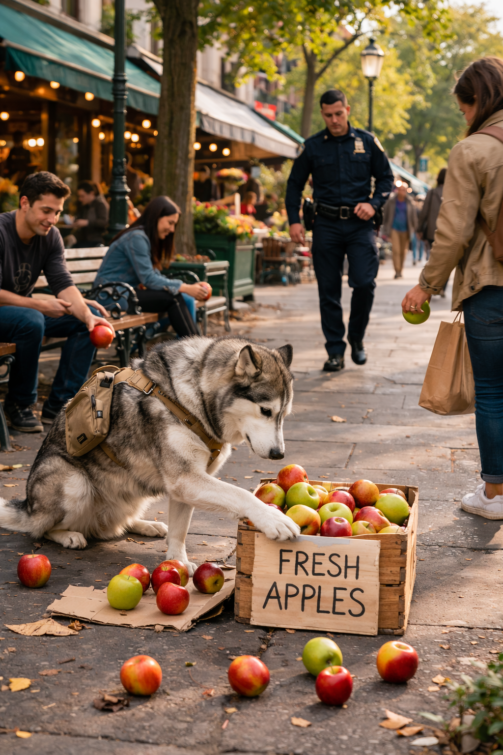 From another angle along the same street, the husky gently nudged a few apples from the crate and placed them neatly on the sidewalk.