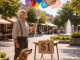 On a bright morning in a lively city street lined with small cafés and shady trees, people walked along the sidewalk enjoying the calm start of the day.