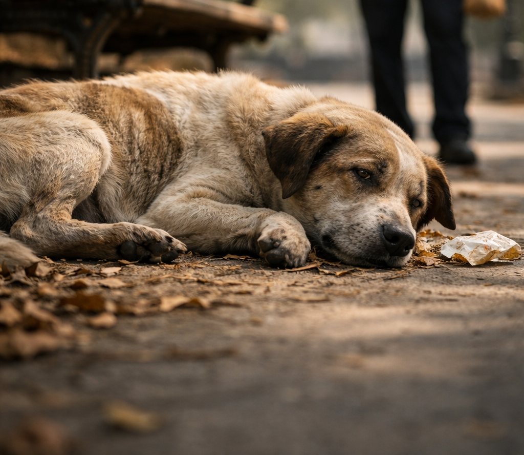 It was lying near a wooden bench, curled into itself, barely moving. Its body looked fragile, ribs slightly visible, and its posture didn’t look like rest—it looked like exhaustion.
