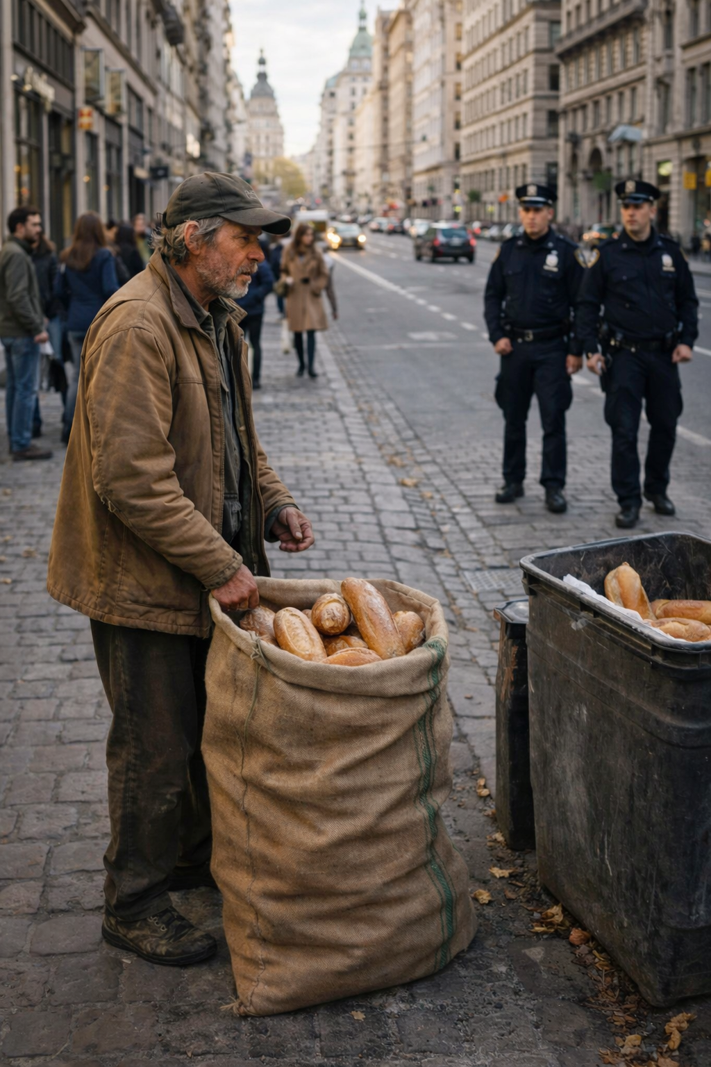 Without explanation, one of them threw the bread loaves into the bin.