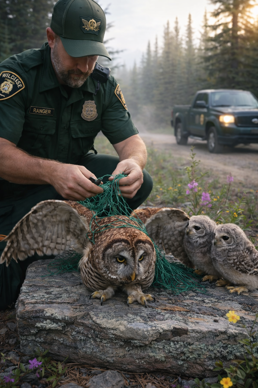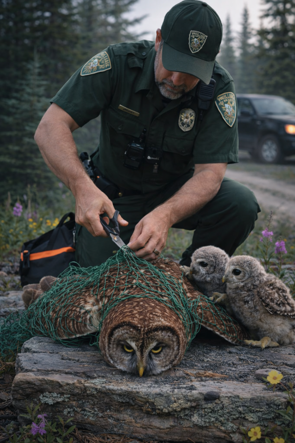 They pecked gently at the net with their small beaks, trying to free the trapped owl.