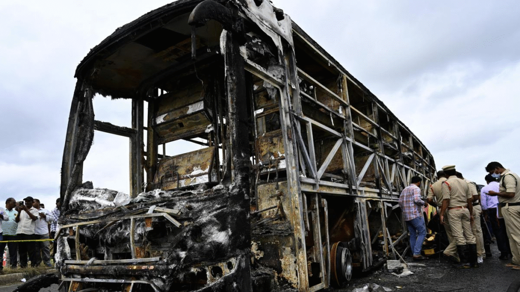 KURNOOL, ANDHRA PRADESH – Minst 25 människor har mist livet i en tragisk bussolycka som inträffade under fredagsmorgonen den 24 oktober 2025 i Kurnool-distriktet i den sydindiska delstaten Andhra Pradesh. Olyckan skedde när bussen, som var på väg från Hyderabad till Bengaluru, kolliderade med en motorcykel. Kollisionen ledde till en explosion och en våldsam brand som snabbt slukade fordonet.