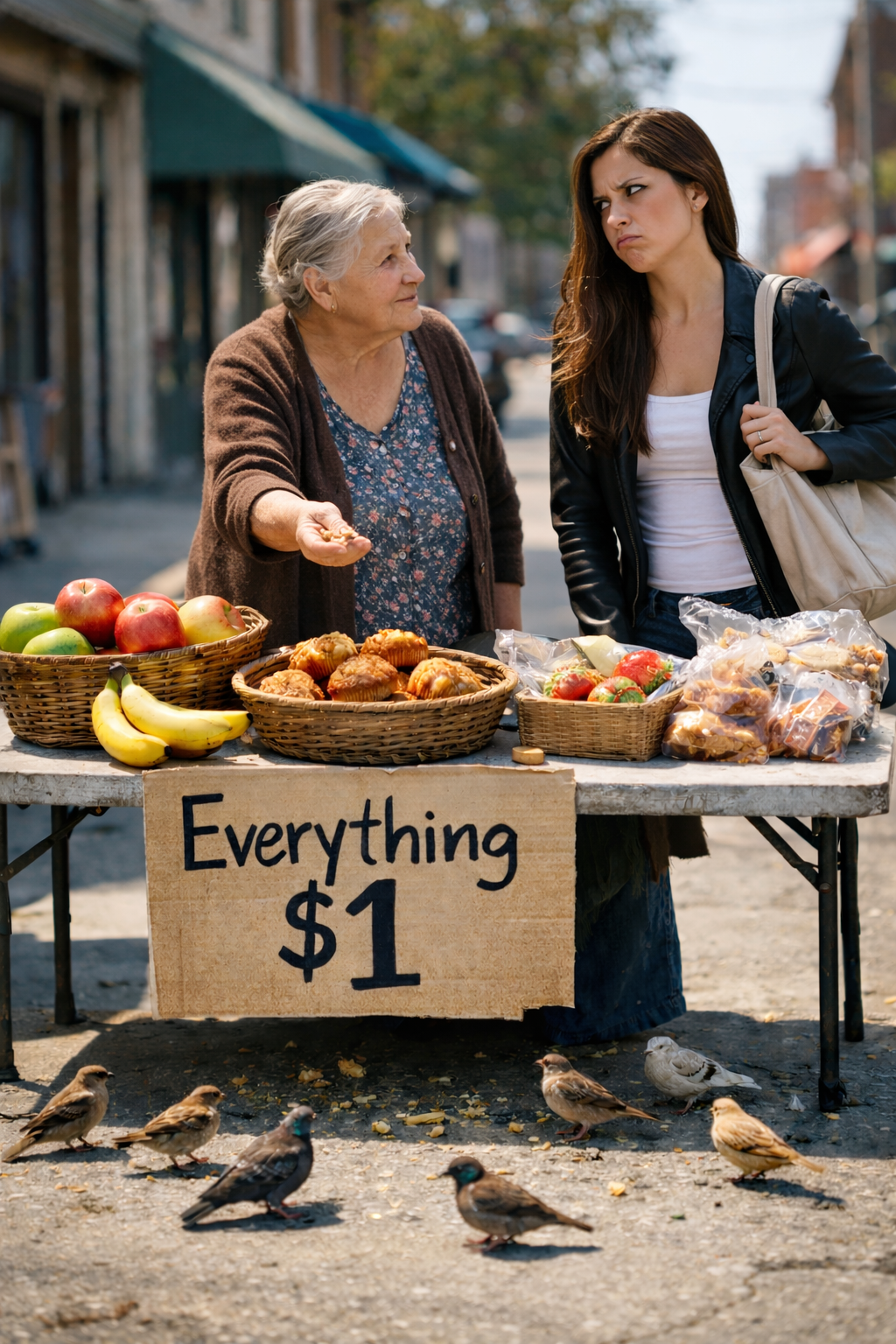 At the edge of the sidewalk, an older woman stood behind a simple table. On it were small food items—bread, fruit, and a few basic snacks. Nothing expensive, nothing fancy. Just enough to get through the day.