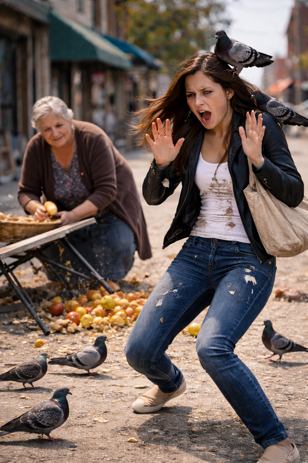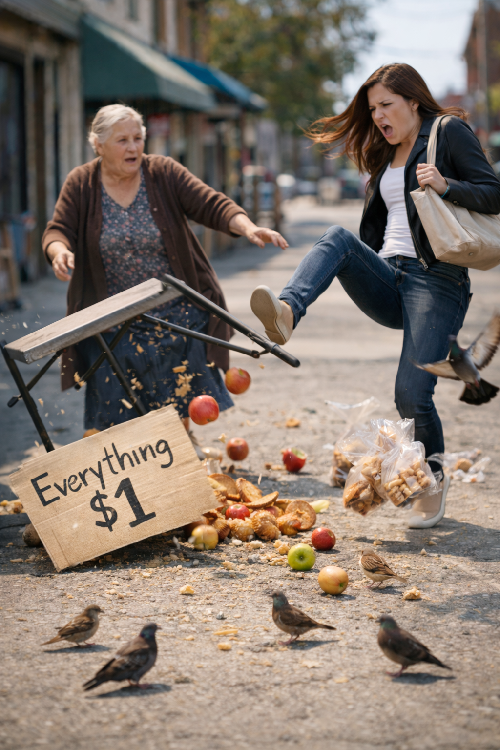 The young woman suddenly moved forward and kicked the table. The items scattered across the ground—bread rolling away, fruit bouncing lightly, small pieces spreading across the pavement. The older woman stepped back in shock, caught off guard by the sudden action.
