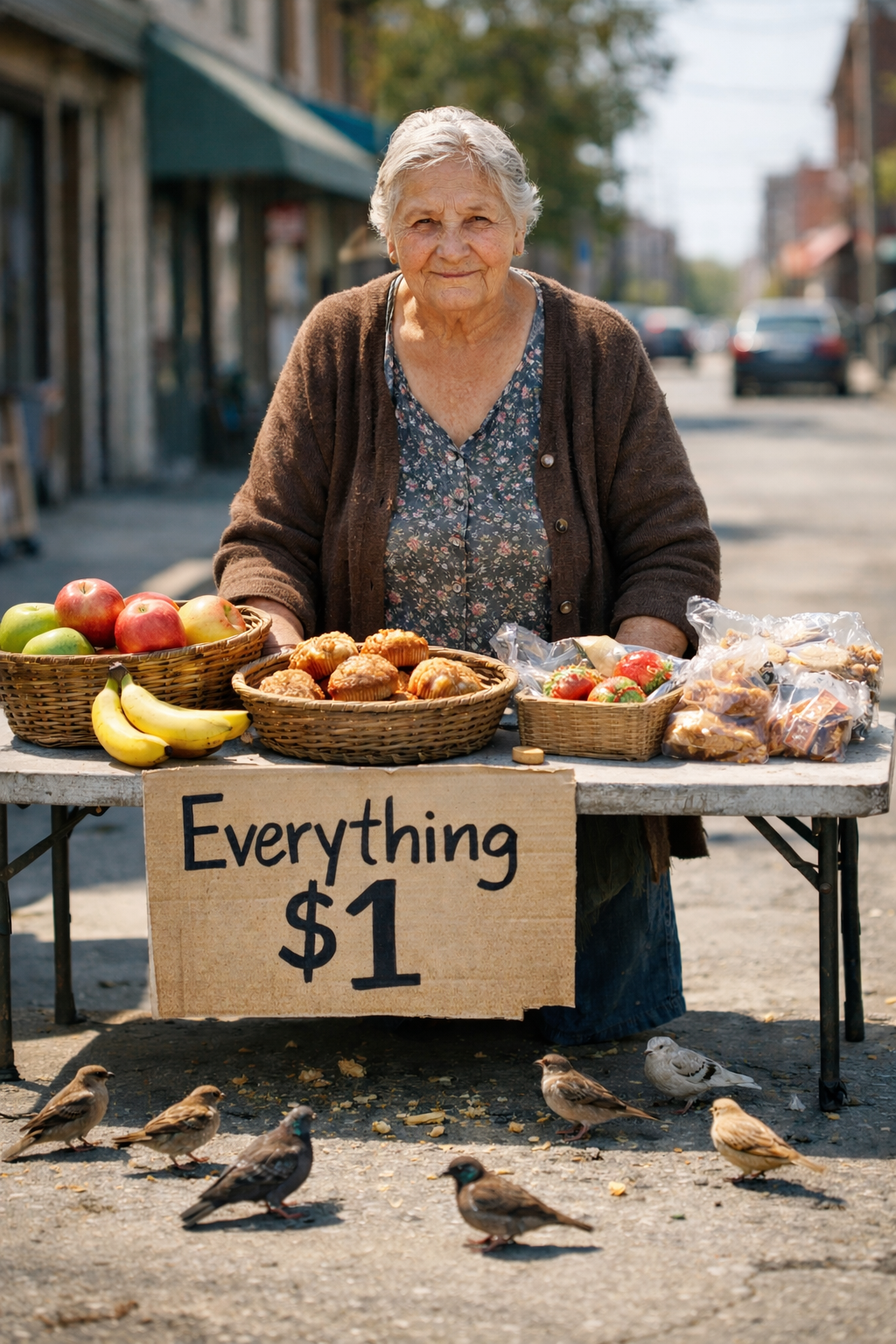 At the edge of the sidewalk, an older woman stood behind a simple table. On it were small food items—bread, fruit, and a few basic snacks. Nothing expensive, nothing fancy. Just enough to get through the day.