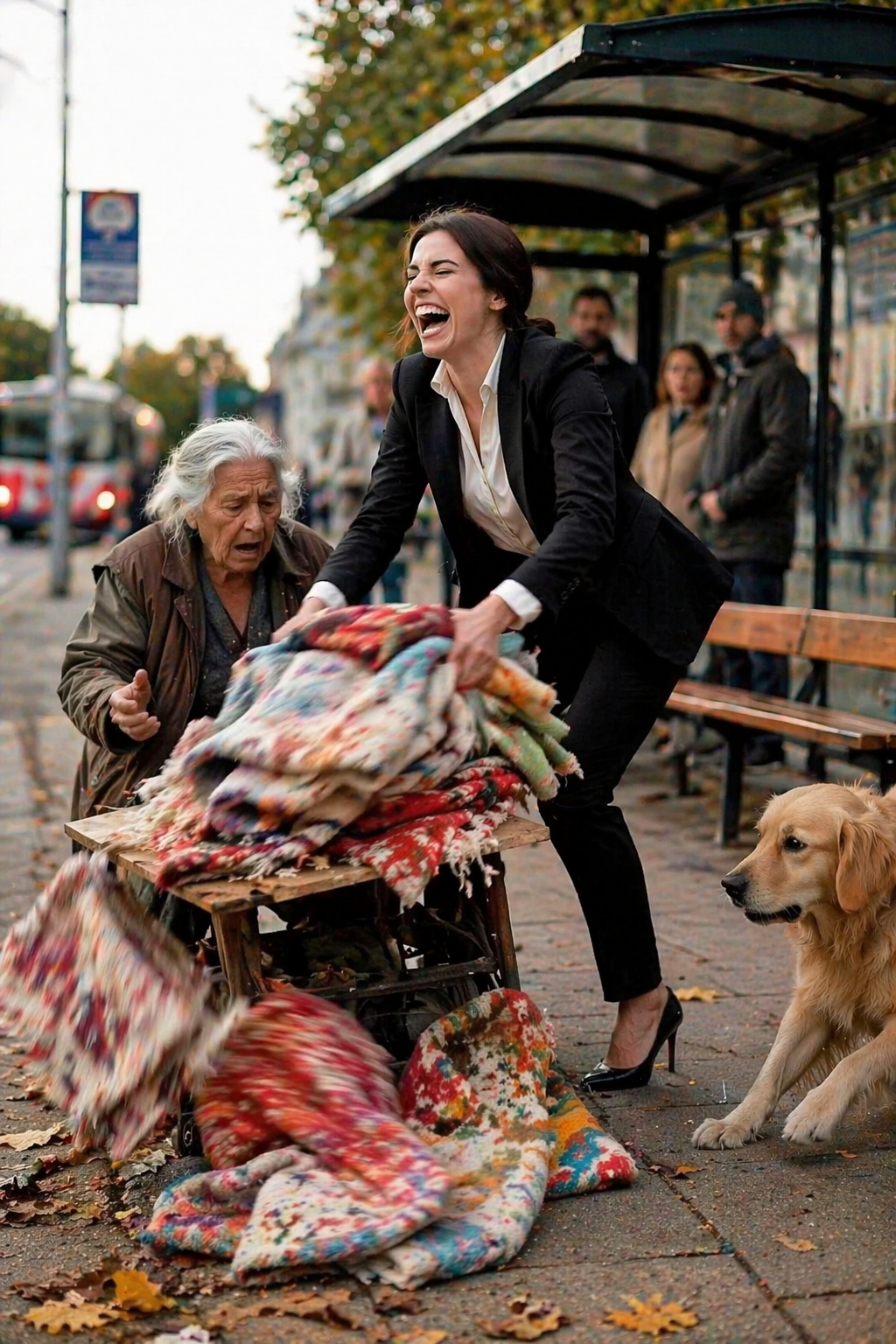 The young woman swept her arm across the table, knocking the folded blankets to the ground. The fabric scattered across the sidewalk, some landing in dirt, others among the fallen leaves, losing the careful order they once had.
