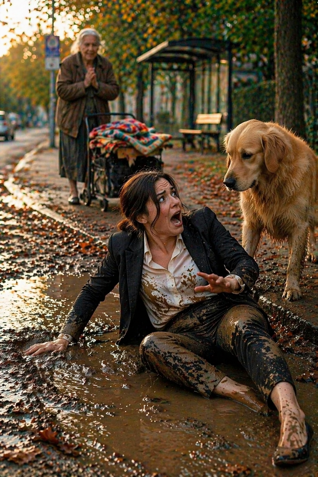 She fell forward, her body unable to recover in time. The mud splashed around her, covering parts of her clothes, breaking the perfect image she carried just moments before.