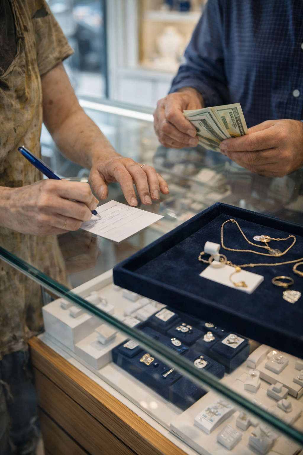 After a few moments, the jeweler counted some cash and placed it carefully on the counter.