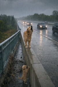 She noticed something unusual on the concrete barrier that divided the road from the drainage below. A large golden dog stood there, completely soaked, barking into the storm. Not the playful kind of barking. This was urgent. Repeated. Desperate.
