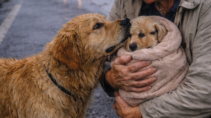 She lifted the puppy slowly, gently, bringing it up from the water. The tiny body shook from cold and fear. The mother dog stepped closer, sniffing, checking, making sure her baby was safe.