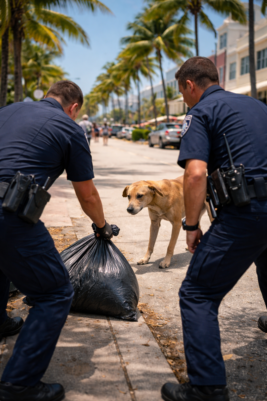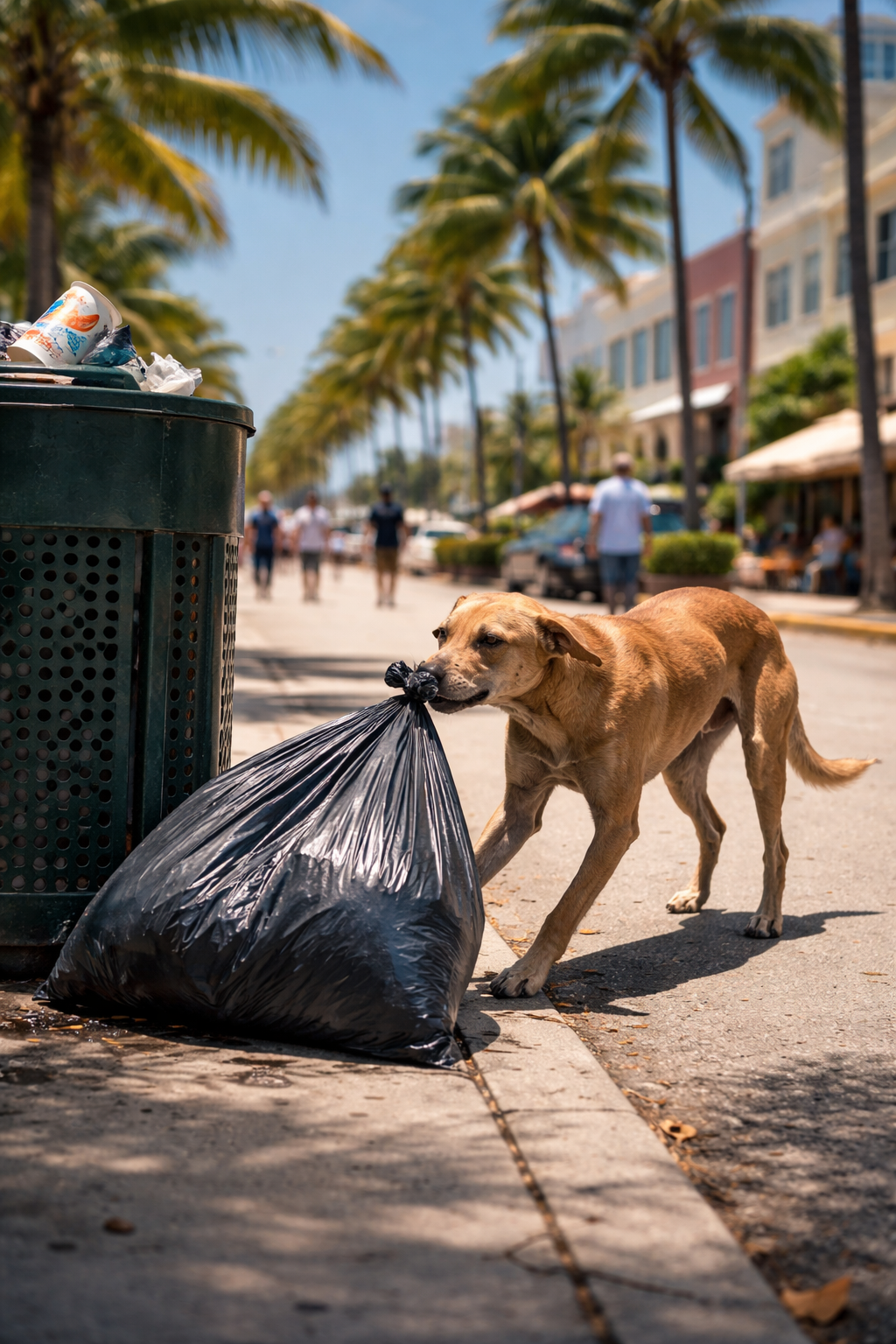 On a sunny afternoon along a busy sidewalk in Miami Beach, a stray dog moved near a public trash bin. The area was full of life — palm trees lining the street, pastel-colored buildings reflecting the sunlight, and people walking past without paying much attention to anything outside their routine.