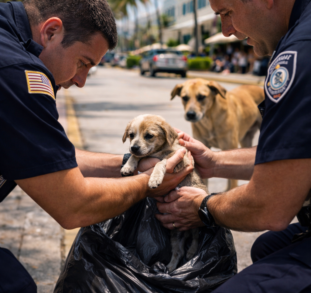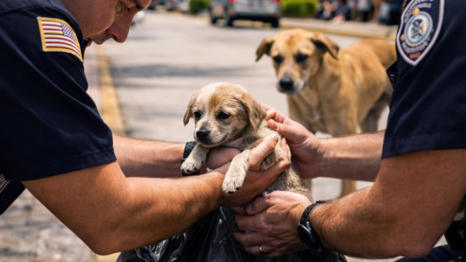 The officers reacted without hesitation. The puppy was removed quickly but carefully, making sure it could breathe properly. Its condition showed signs of distress, but it was alive, and that was enough to act fast.