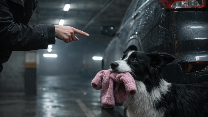 Late at night inside an underground parking garage, a black-and-white Border Collie was seen standing near a luxury SUV. Rainwater dripped from the concrete ceiling, and shattered tail light glass lay scattered on the ground.