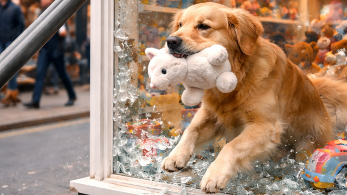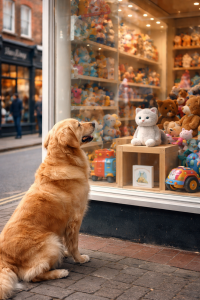 On a quiet street filled with small local shops, a golden retriever stood outside a toy store window. Inside the display were colorful toys, stuffed animals, and small plush figures arranged neatly behind the glass.