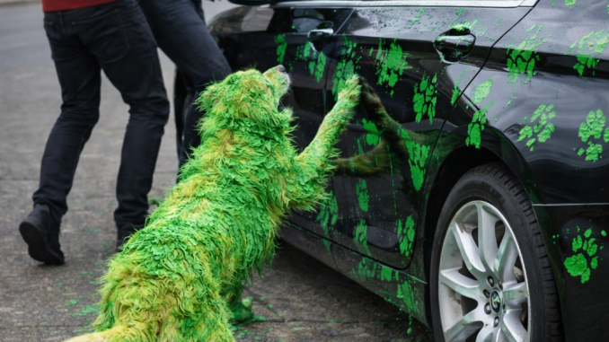 The green-paint-covered dog ran straight toward their vehicle.
