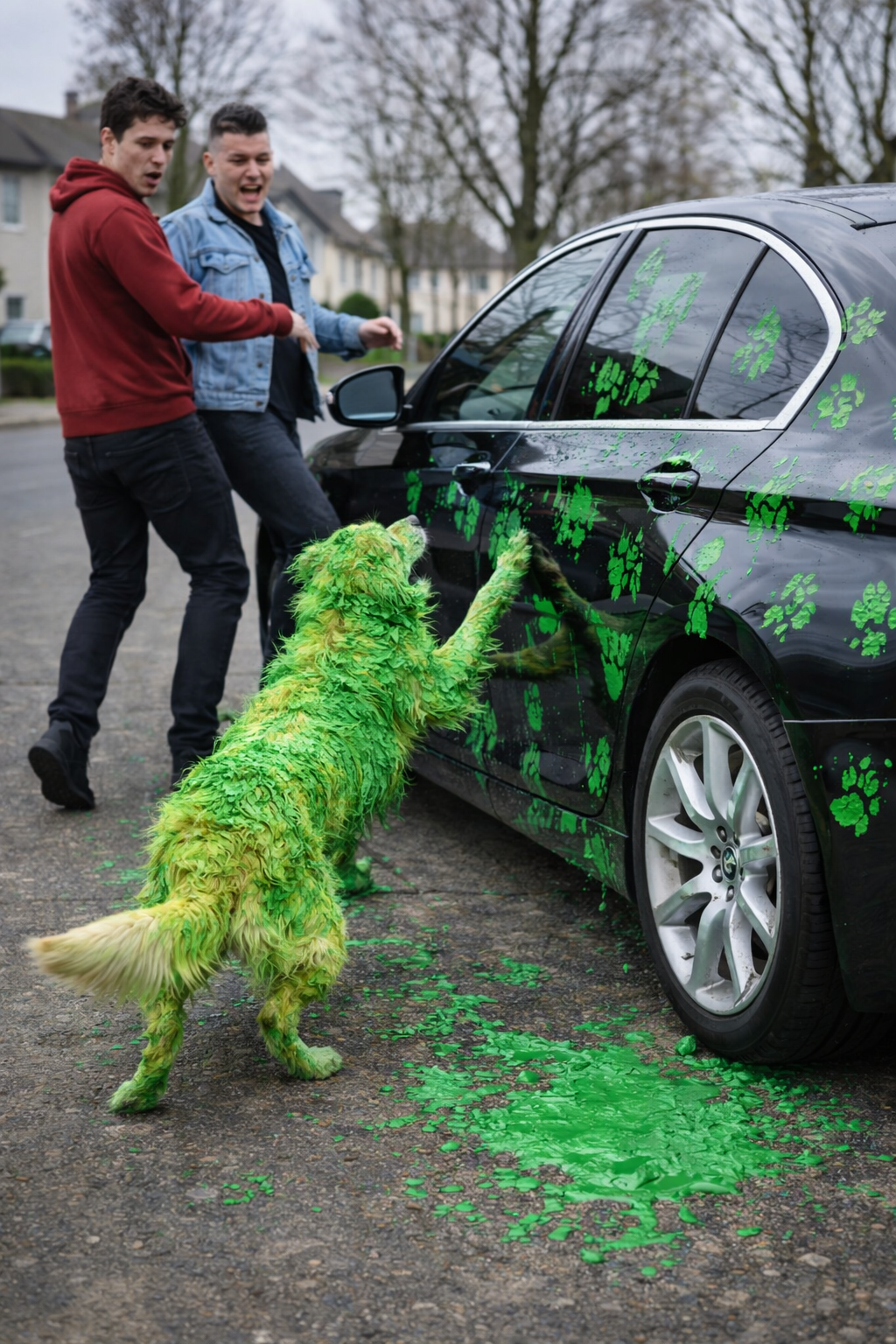 But inside, the seats were already covered with green paint from the dog’s fur.