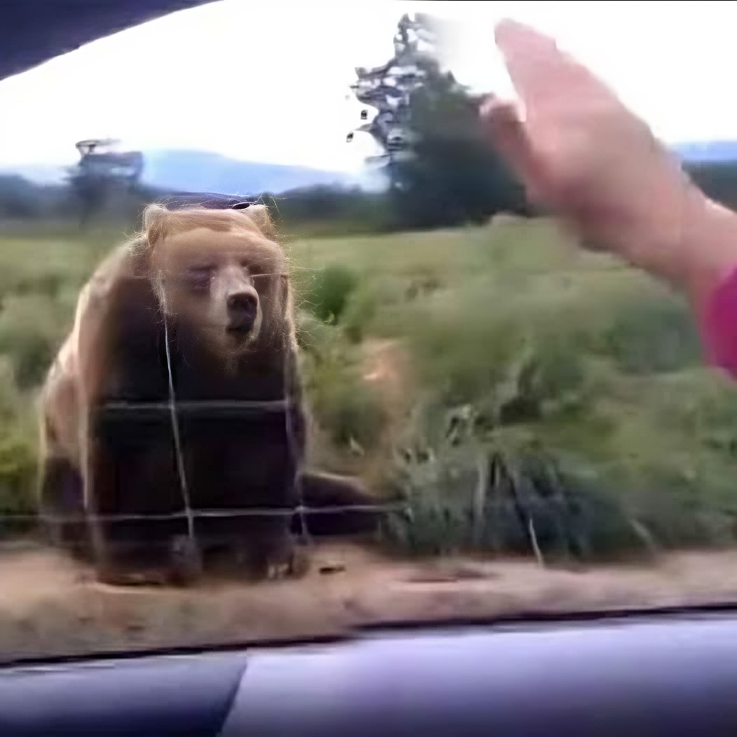 «Titta på björnens förskräckta reaktion när kvinnan vinkar till honom från sin bil. Efter en sekund…»
