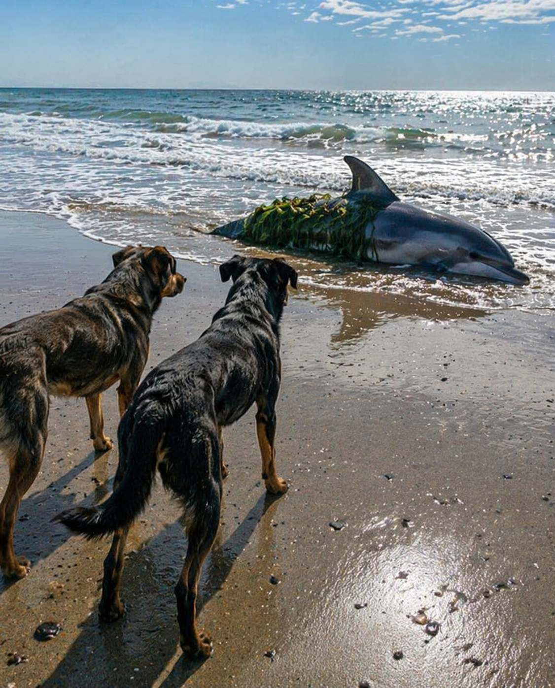The brown dog stepped closer, lowering its head carefully, sniffing near the dolphin. The other stayed slightly back, scanning the distance, as if searching for something else.