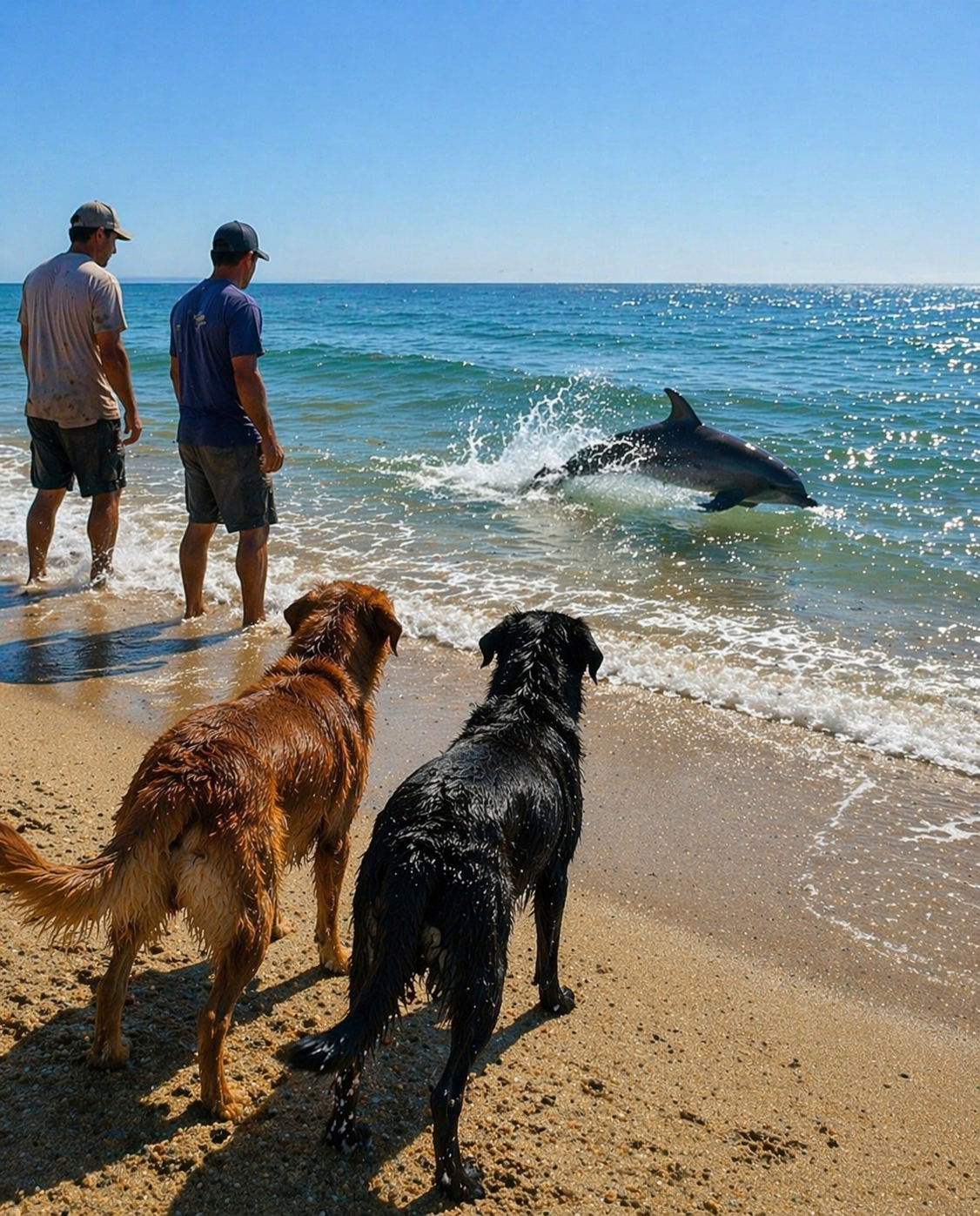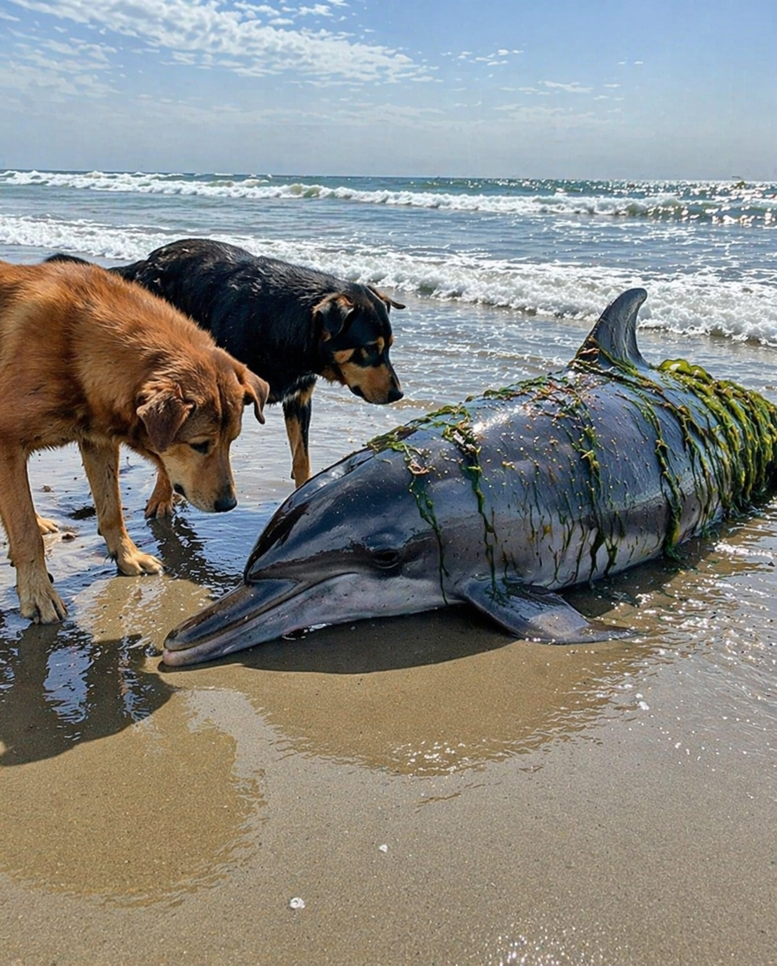 The closer they got, the clearer it became. The dolphin moved slightly, its tail hitting the sand with weak effort. It wasn’t aggressive. It wasn’t reacting to the dogs as a threat. It was simply struggling.