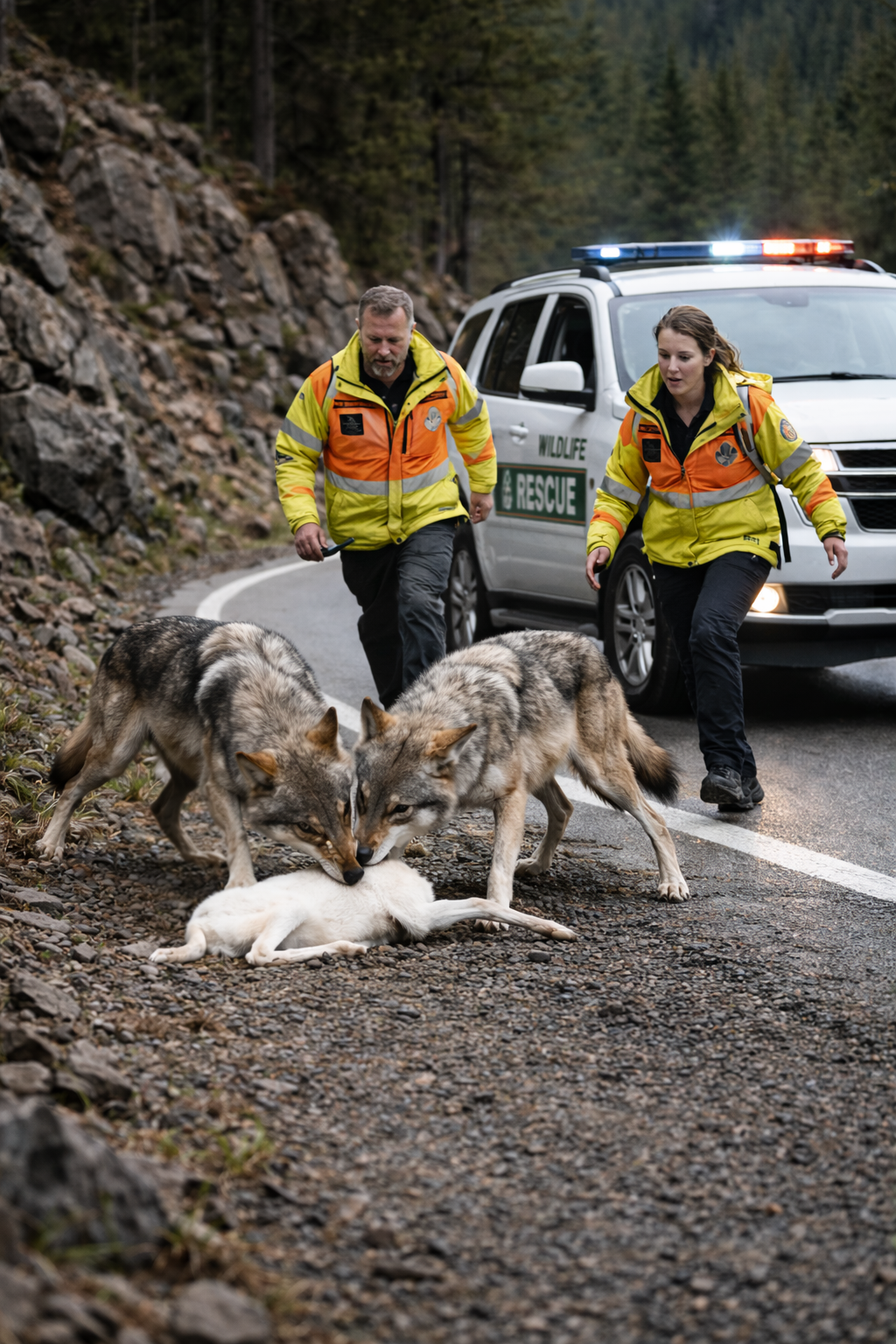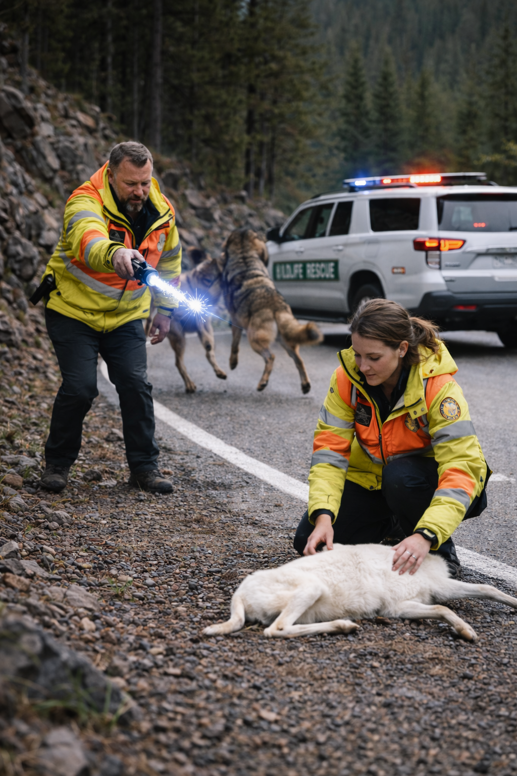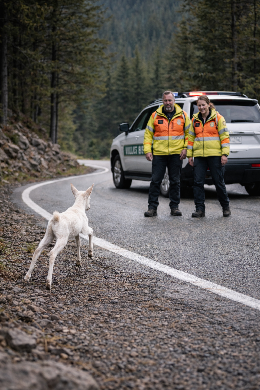 A white wildlife rescue vehicle appeared around the curve of the road.