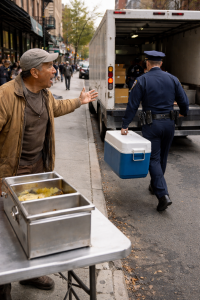Without raising his voice or creating a scene, the officer began removing the vendor’s cooler and walking toward a municipal truck parked nearby.
