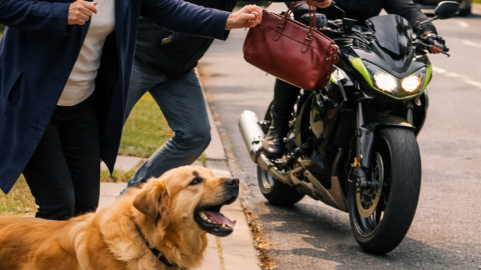 Meanwhile, the golden retriever calmly picked up the fallen handbag and carried it back down the street.