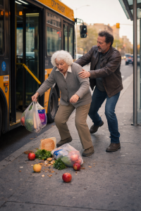 The elderly woman lost her balance. Her bags slipped from her hands and fell to the ground. Apples rolled across the pavement, bread slid onto the sidewalk, and the woman collapsed near the curb, clearly shaken.