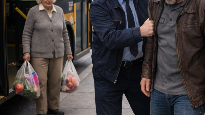 Among them was an elderly woman with white hair, carrying several grocery bags filled with vegetables, bread, and fruit. She moved slowly but carefully toward the bus, trying to step up while balancing the heavy bags.