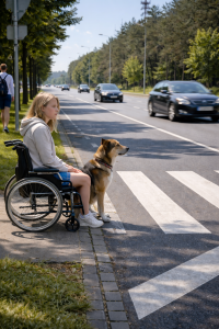 Carefully, she rolled her wheelchair forward and onto the crosswalk. Her movements were controlled, focused. The dog walked slightly ahead of her, staying visible to the stopped vehicles.