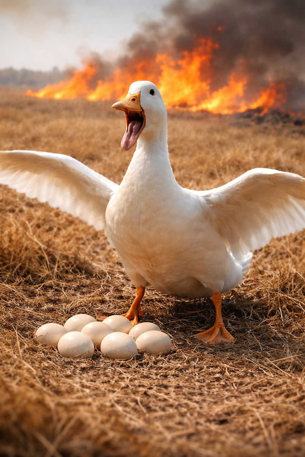 In the middle of that field stood a white duck, guarding a small group of eggs placed directly on the ground. The eggs were exposed, fragile, and completely dependent on her. Unlike other animals that could run or hide, they had no way to escape. The duck’s behavior reflected that reality. Her wings were slightly raised, her beak open, and her movements restless. She wasn’t calm anymore. She understood the danger, even if she couldn’t fully respond to it.