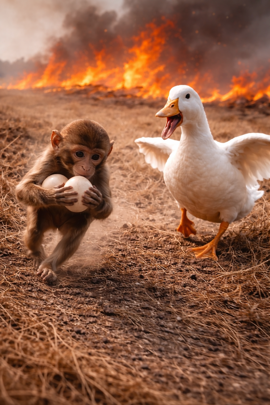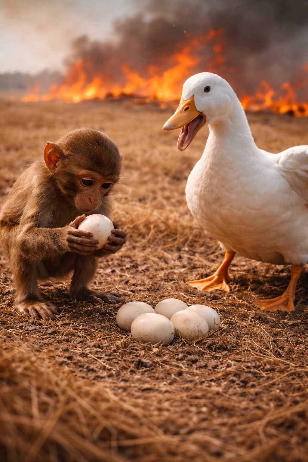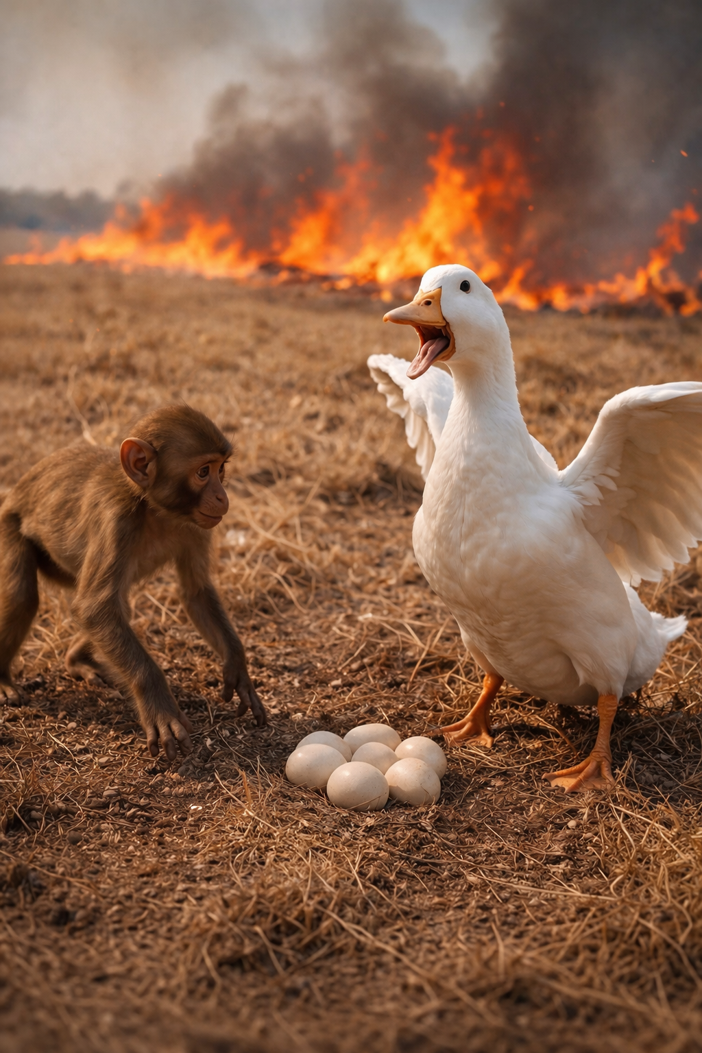 The danger was no longer immediate. The fire remained in the distance, but it was no longer a direct threat. The duck stayed beside the eggs, her posture calm, her movements steady. The monkey remained nearby for a moment, then stepped back, its role in the situation complete.