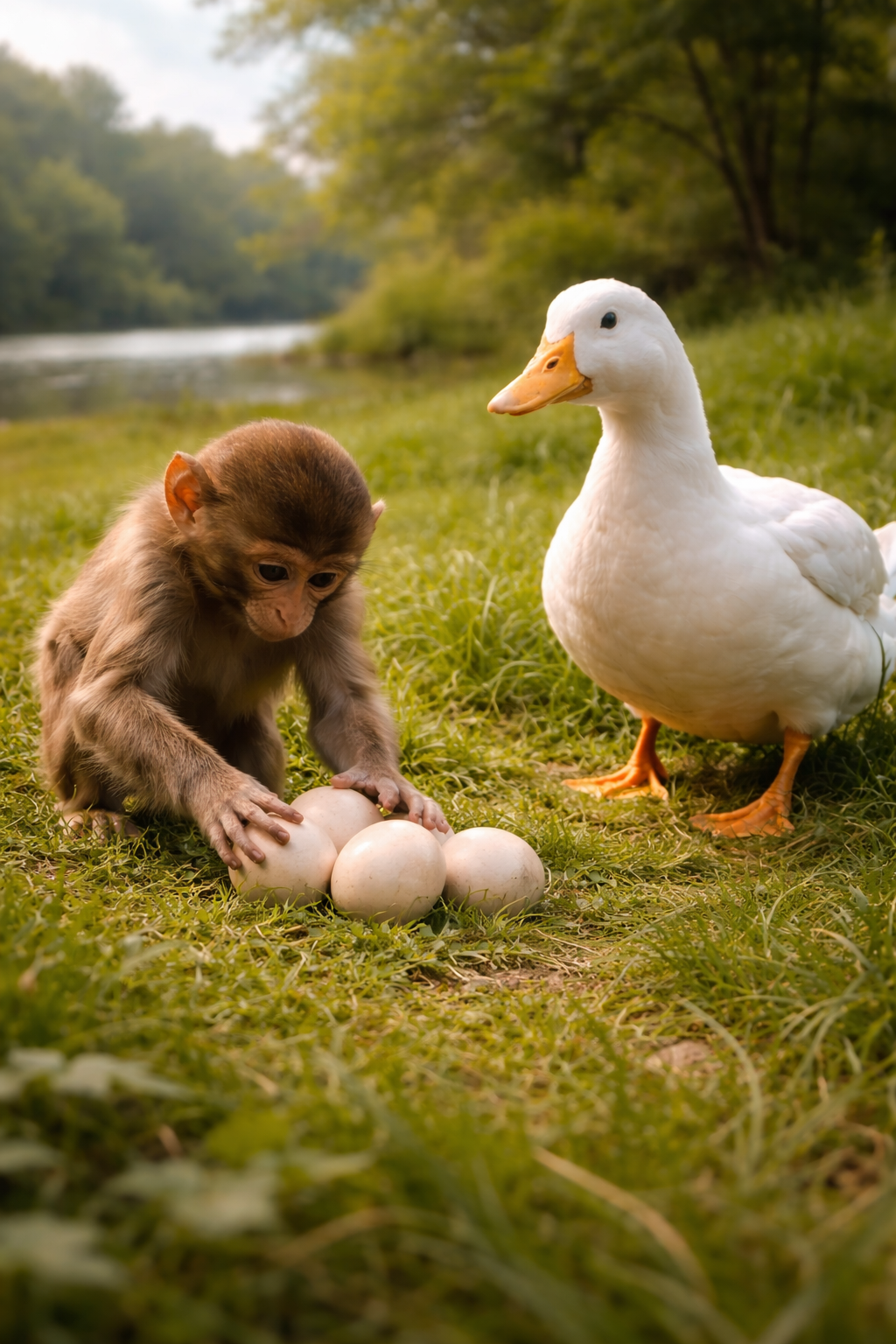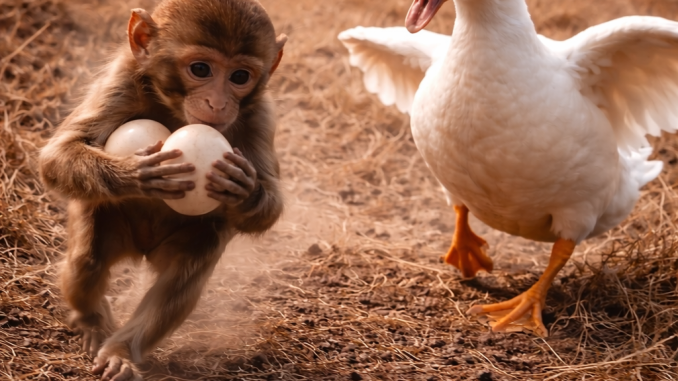 The monkey didn’t stop at one egg. It began gathering more, holding them carefully against its body. The duck followed immediately, staying close, her attention fixed on the eggs rather than anything else.