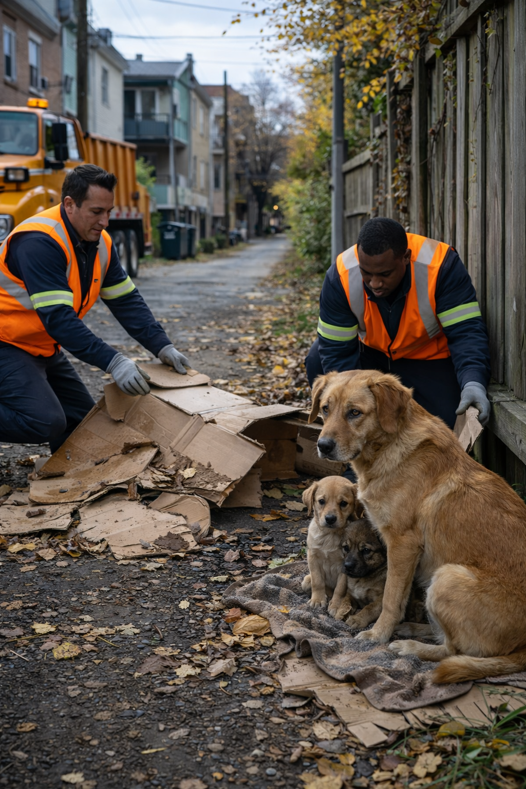 The thin brown dog sat protectively beside her puppies, trying to keep them warm as fallen leaves covered the ground.