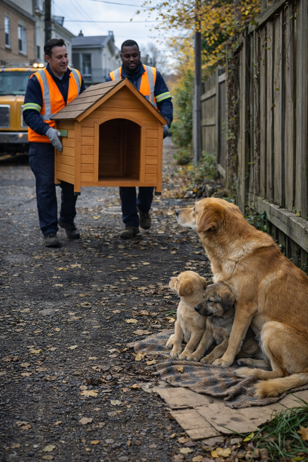 On a quiet autumn afternoon, behind a row of apartment buildings, a small hidden shelter stood beside a fence.