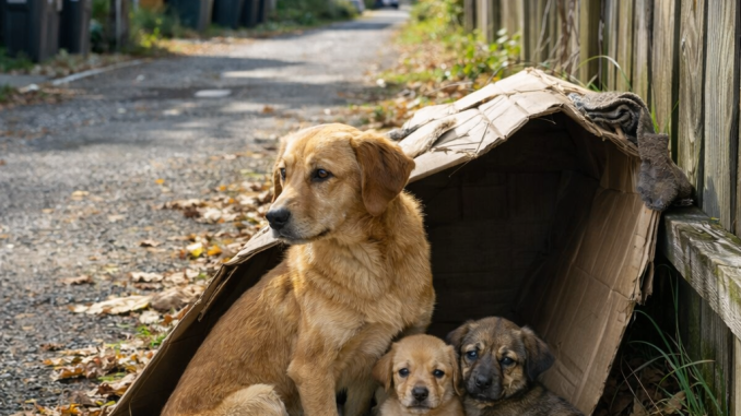 The thin brown dog sat protectively beside her puppies, trying to keep them warm as fallen leaves covered the ground.