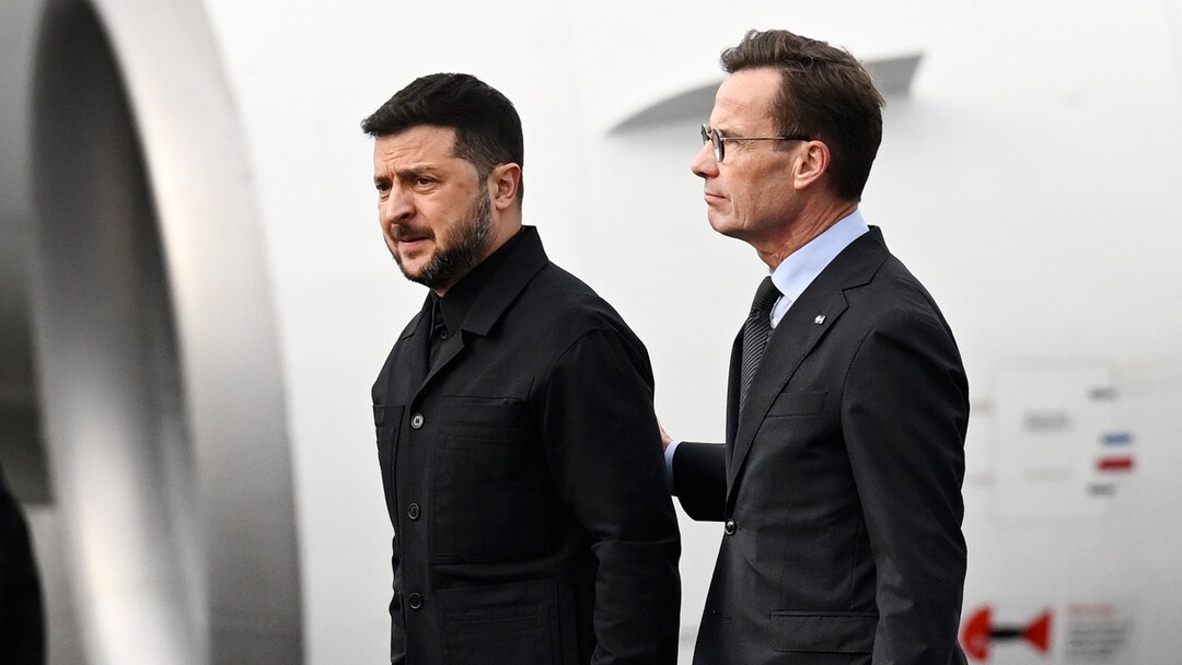 Volodymyr Zelenskyj är i Sverige för ett möte och Ulf Kristersson tar emot honom.